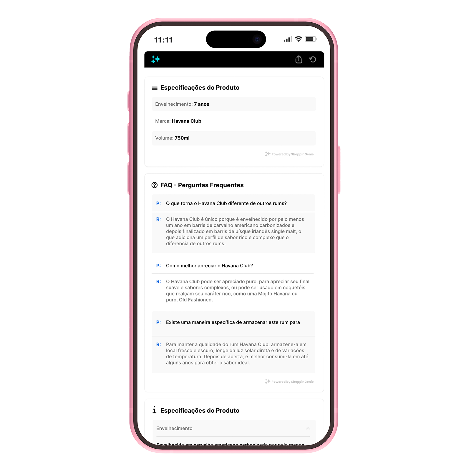 O Smart Product FAQs atua diretamente nas páginas de produto, fornecendo informações adicionais em tempo real para ajudar o cliente a tomar decisões com mais segurança.